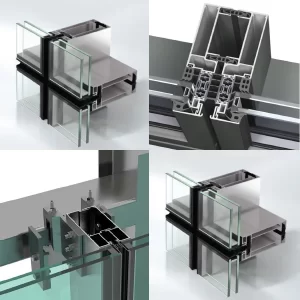 – Khung nhôm unitized: gồm 4 dạng thanh nhôm thành từ âm và dương, thanh ngang âm và dương, kích thước bề rộng của thanh nhôm từ 150 – 250mm, độ dày trung bình từ 3-7mm.